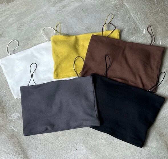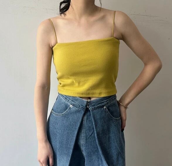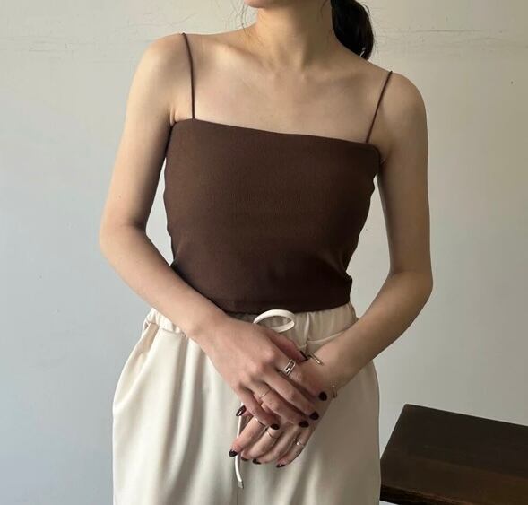 シンプルなストラップにウエスト部分がごたつかず着用できるカップ付きのキャミソール。