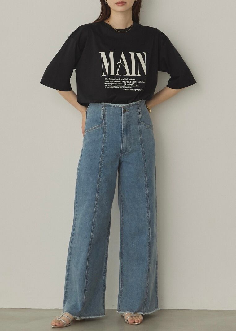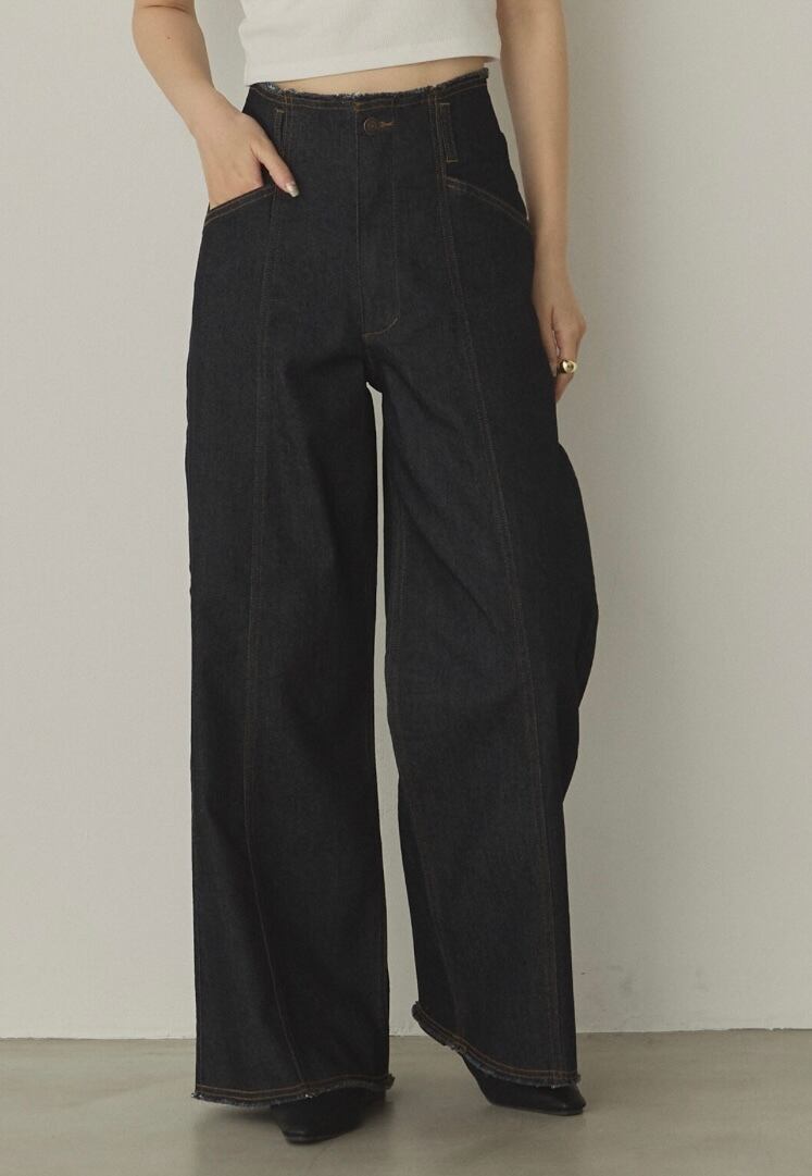 ハイウエストデザインに、フロント中心にステッチをいれ、Iラインを強調しスタイルアップ見えするデニムパンツ。