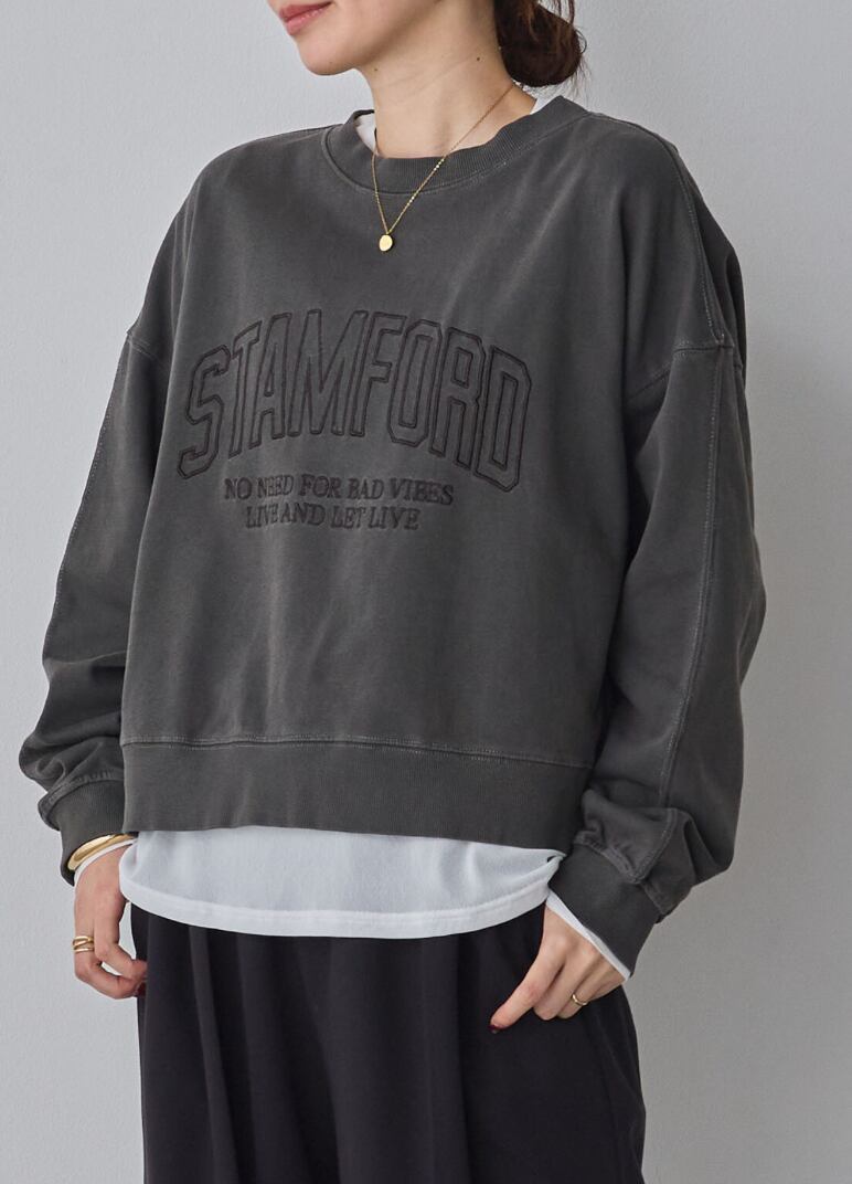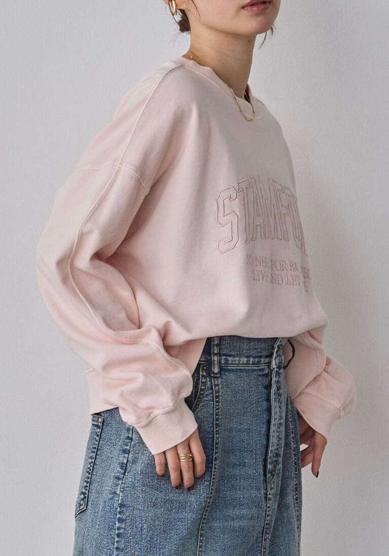 ユーズド感のある製品染めと刺繍ロゴを施したロゴスウェットプルオーバー。