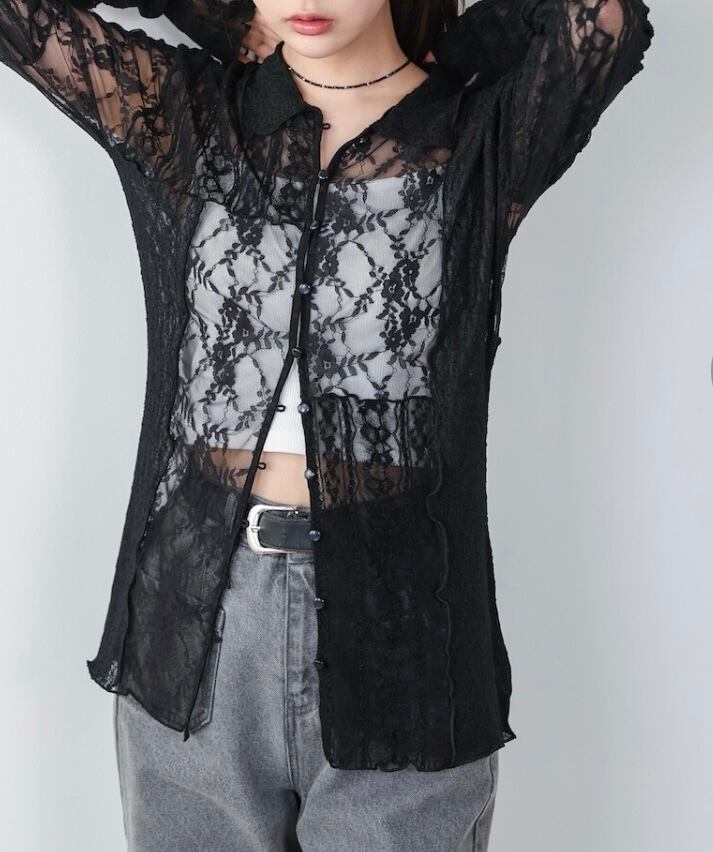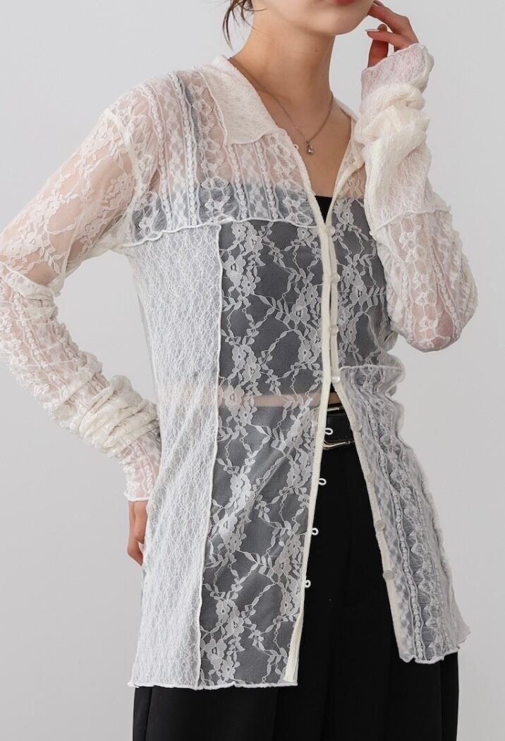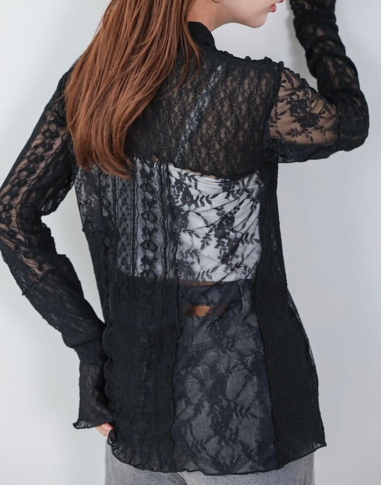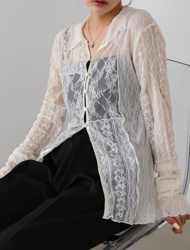 異なるレースを組み合わせたパッチワークデザインが目を引く襟付きシャツ。