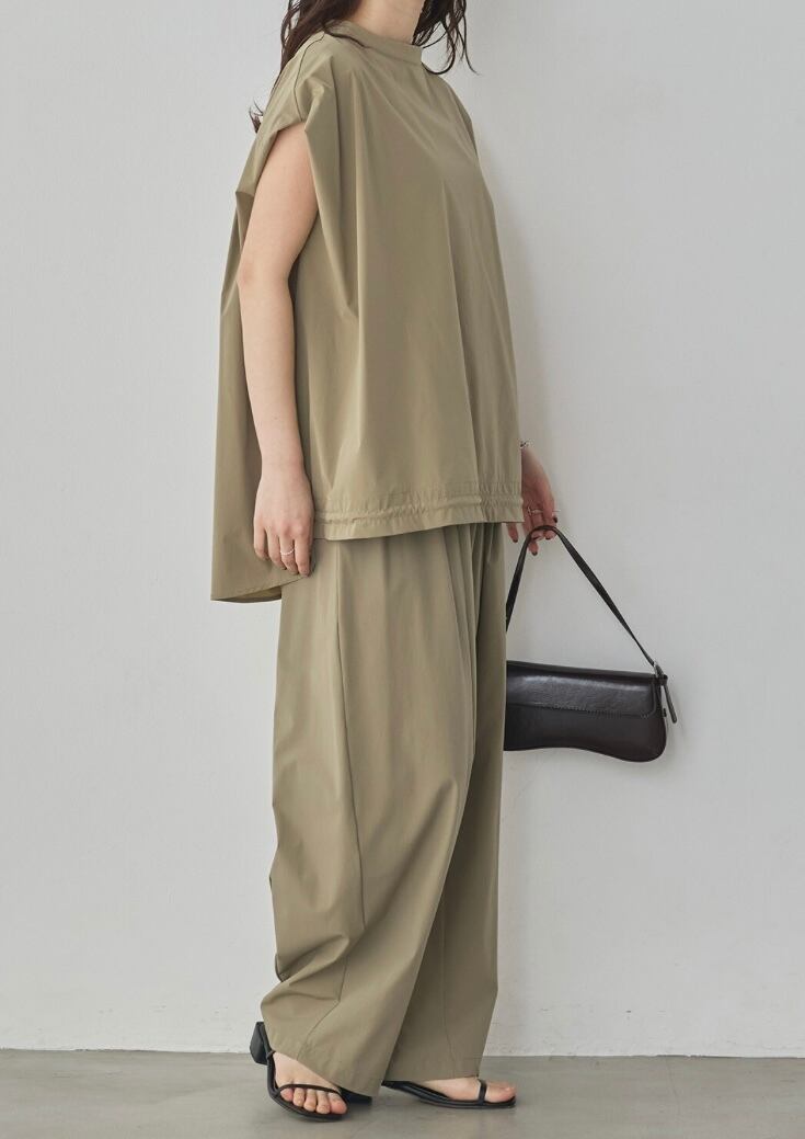 接触冷感・UVカット・シワが付きにくい・ストレッチ・撥水加工の5つのメリット付き。さらっとしたタッチで真夏も快適に過ごせる素材感のパンツです。