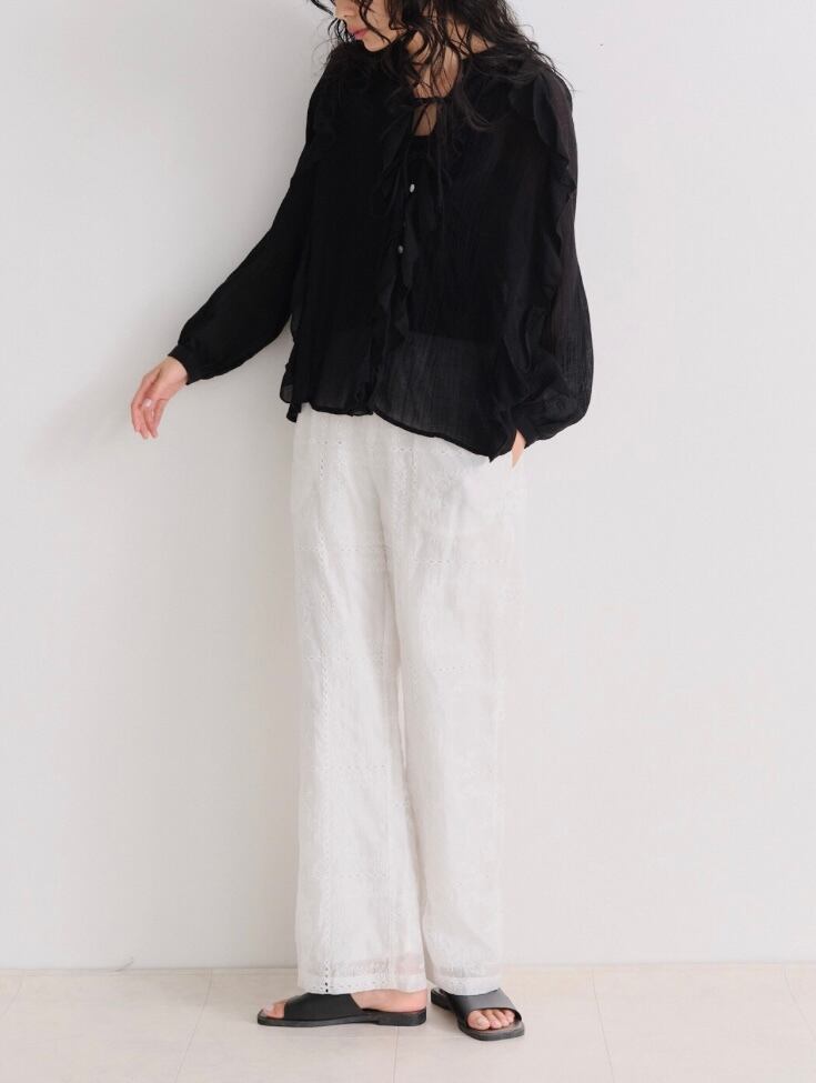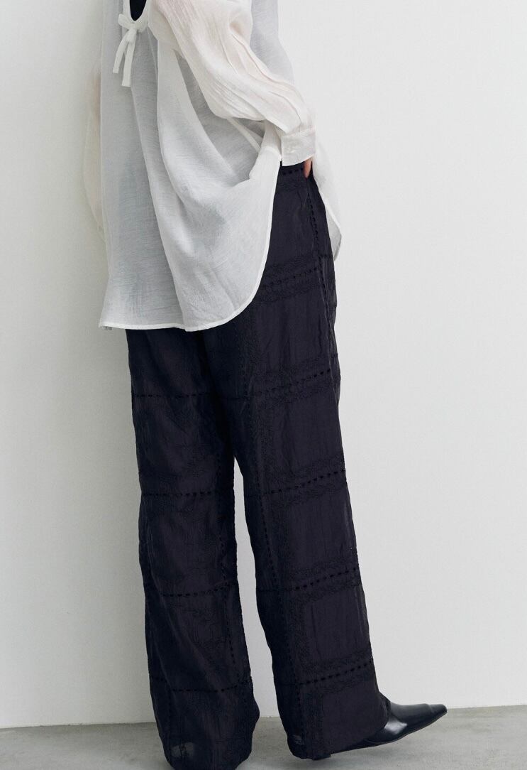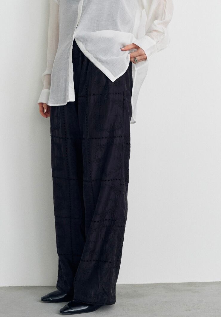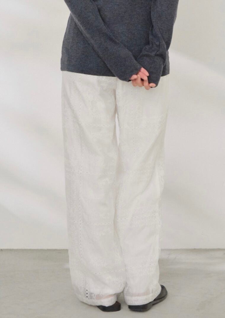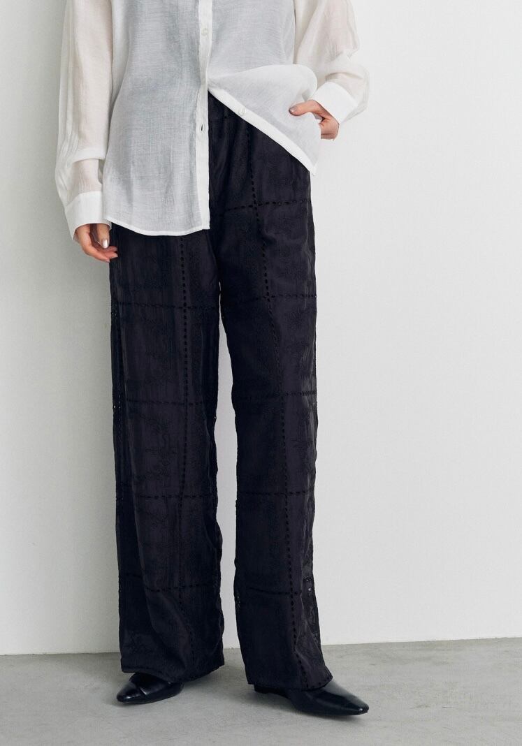 繊細な刺繍が全体に施された、上品な透け感のパンツ。