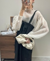 リラックスムードを演出するゆったりしたサイズ感で、シアー感がありながらもハイネックデザインで露出しすぎないデザインです。
