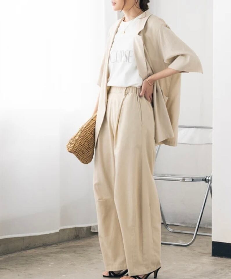 履くとルーズな立体感が生まれるシルエットが魅力的なカーヴィーパンツ。ウエストはゴム仕様なので着用しやすく、通気性も良く清涼感のある素材です。